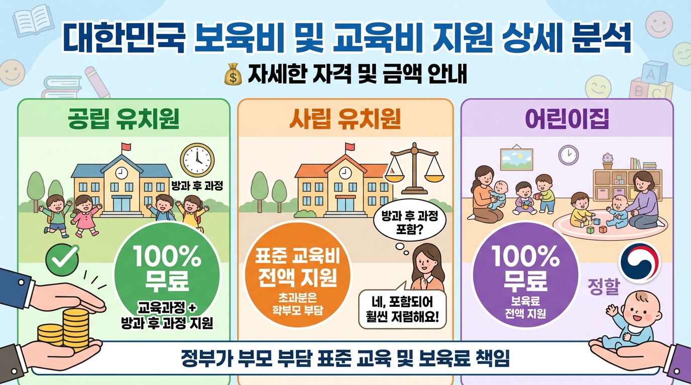 구체적으로는 유치원의 유아학비와 어린이집의 보육료가 전액 지원됩니다. 다만, 사립 유치원의 경우 정부 지원금을 초과하는 '학부모 부담금'이 일부 발생할 수 있다는 점은 꼭 체크하셔야 해요. 그래도 예전보다 부담이 확 줄어든 건 확실합니다.