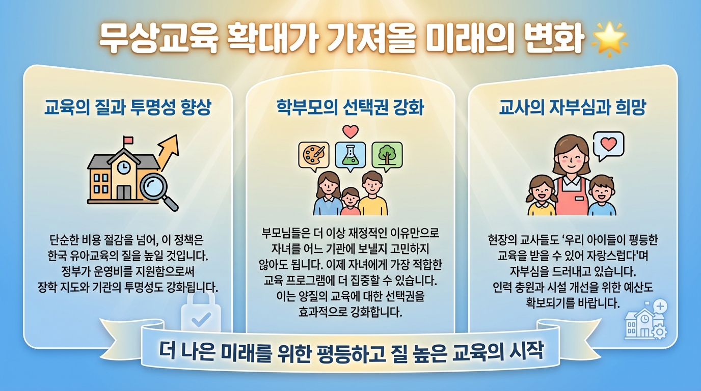 단순히 돈을 아끼는 것을 넘어, 이번 정책은 우리나라 유아 교육의 질을 한 단계 높이는 계기가 될 것입니다. 정부가 운영비를 지원하는 만큼 기관에 대한 장학 지도와 투명성 강화가 병행되기 때문이죠.