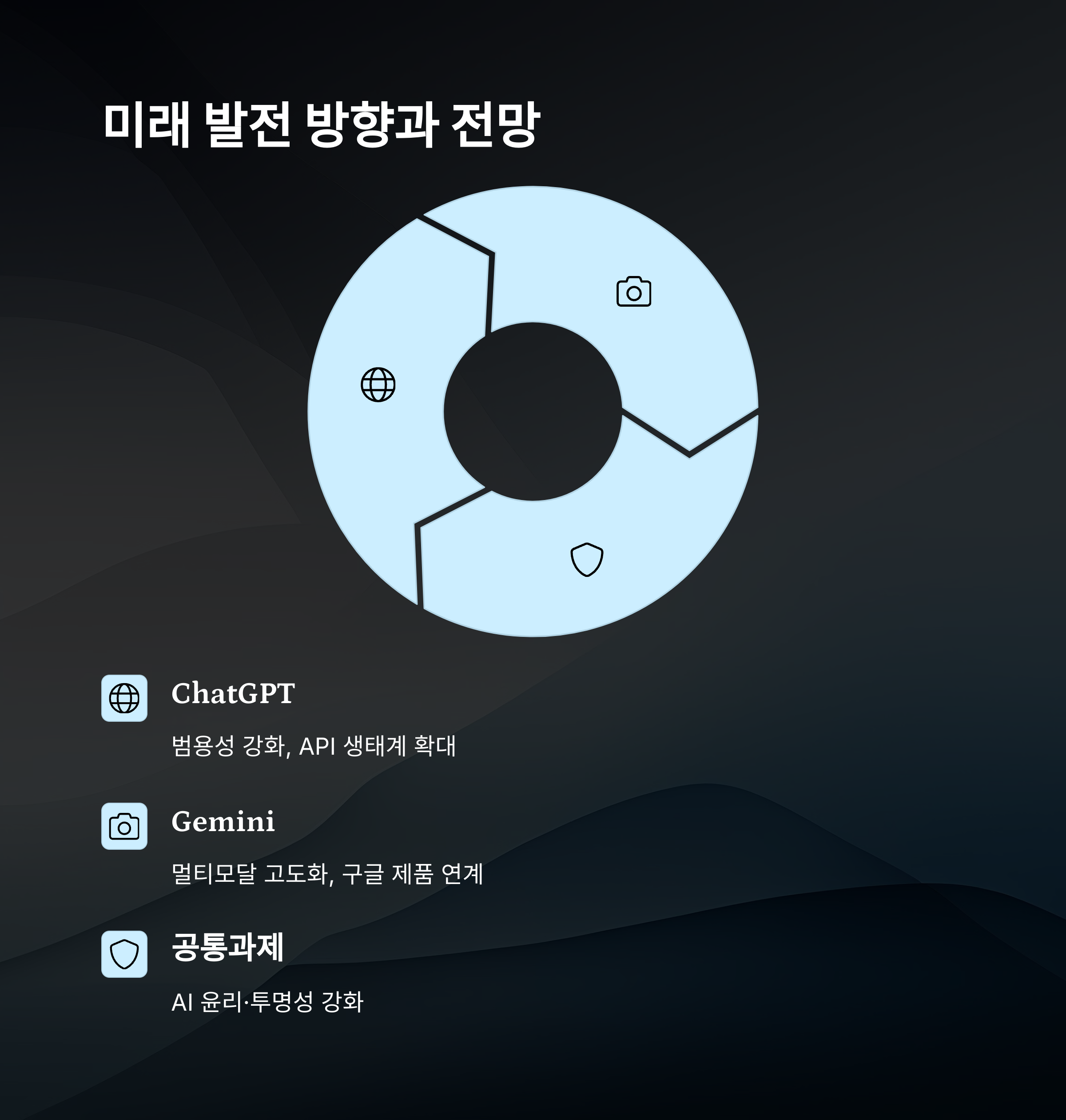AI의 미래를 이야기할 때 ChatGPT와 제미니는 중심적인 역할을 하게 될 거예요. 우선 ChatGPT는 창의적 콘텐츠 생산과 인간 중심 대화형 인터페이스 개발에 집중하고 있어요. 최근엔 음성 대화, 이미지 이해, 코드 생성 능력까지 빠르게 확장되며 '멀티모달 AI'로 진화하고 있죠.